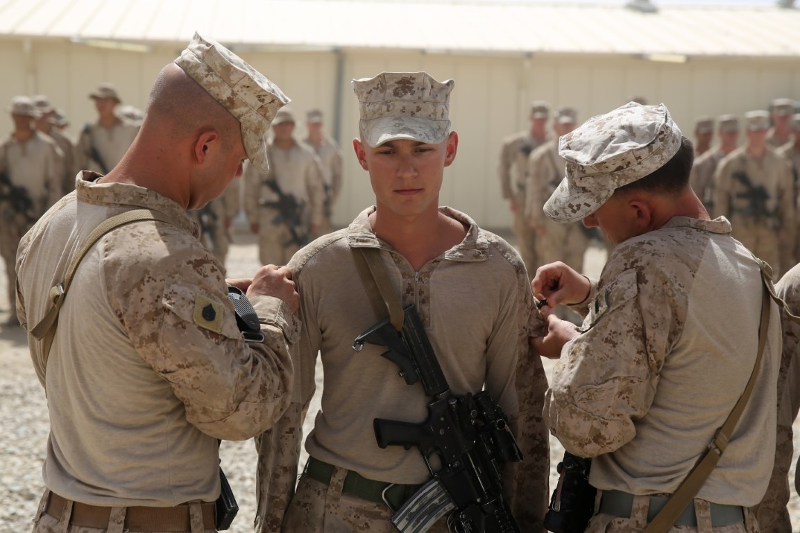 Corporal Jacob Gamble, a native of Oskaloosa, Kansas, stands at attention while Marines pin corporal insignia to his collar during a promotion ceremony aboard Camp Leatherneck, Afghanistan, June 1, 2014. Gamble, a field radio operator with Headquarters and Service Company, 1st Battalion, 7th Marine Regiment, and 20 other lance corporals with the battalion were promoted to corporal, June 1 and 2. (U.S. Marine Corps photo by Cpl. Joseph Scanlan / released)