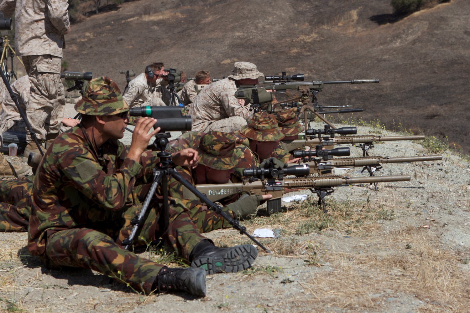 New Zealand and Canadian Army snipers shoot side-by-side with scout snipers serving with 1st Reconnaissance Battalion and 1st Battalion, 1st Marine Regiment, at Range 108 during Exercise Dawn Blitz 2013 here, June 12. Throughout the day of shooting, the snipers shared different tips and techniques taught by their different units and schools. During the live-fire exercise, the snipers engaged known distance, unknown distance and one-shot-one-kill targets up to 1,200 meters away. Dawn Blitz 2013 is a scenario-driven exercise designed to test Navy and Marine Corps forces at the Marine Expeditionary Brigade (MEB) and Expeditionary Strike Group (ESG) level, while promoting military-to-military cooperation and interoperability with partnered nations.