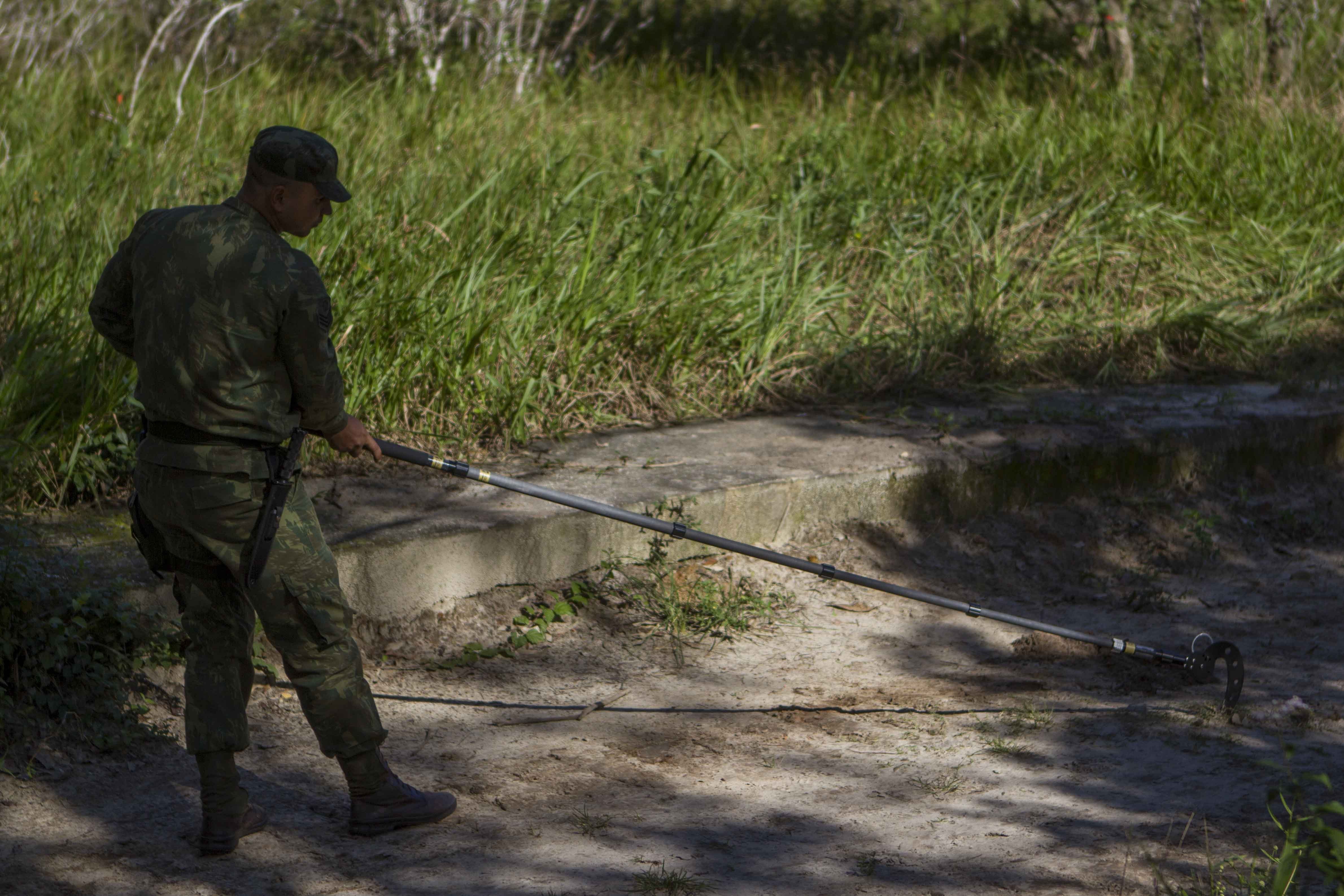 A Brazilian special forces Marine utilizes a holly stick to inspect the ground where a simulated improvised explosive device is suspected to be laid during a counter IED course held on Marambaia Island, Brazil, Aug. 6, 2014. The counter IED course was conducted by U.S. and Brazilian Marines in conjunction with a combat tracking course as part of a theater security cooperation bi-lateral exchange. Through close cooperation, the U.S. and its partners are ready to address transnational security challenges through integrated and coordinated approaches. SPMAGTF-South is currently embarked aboard the future amphibious assault ship USS America (LHA 6) in support of her maiden transit, "America Visits the Americas." (U.S. Marine Corps Photo by Cpl. Donald Holbert/ Released)