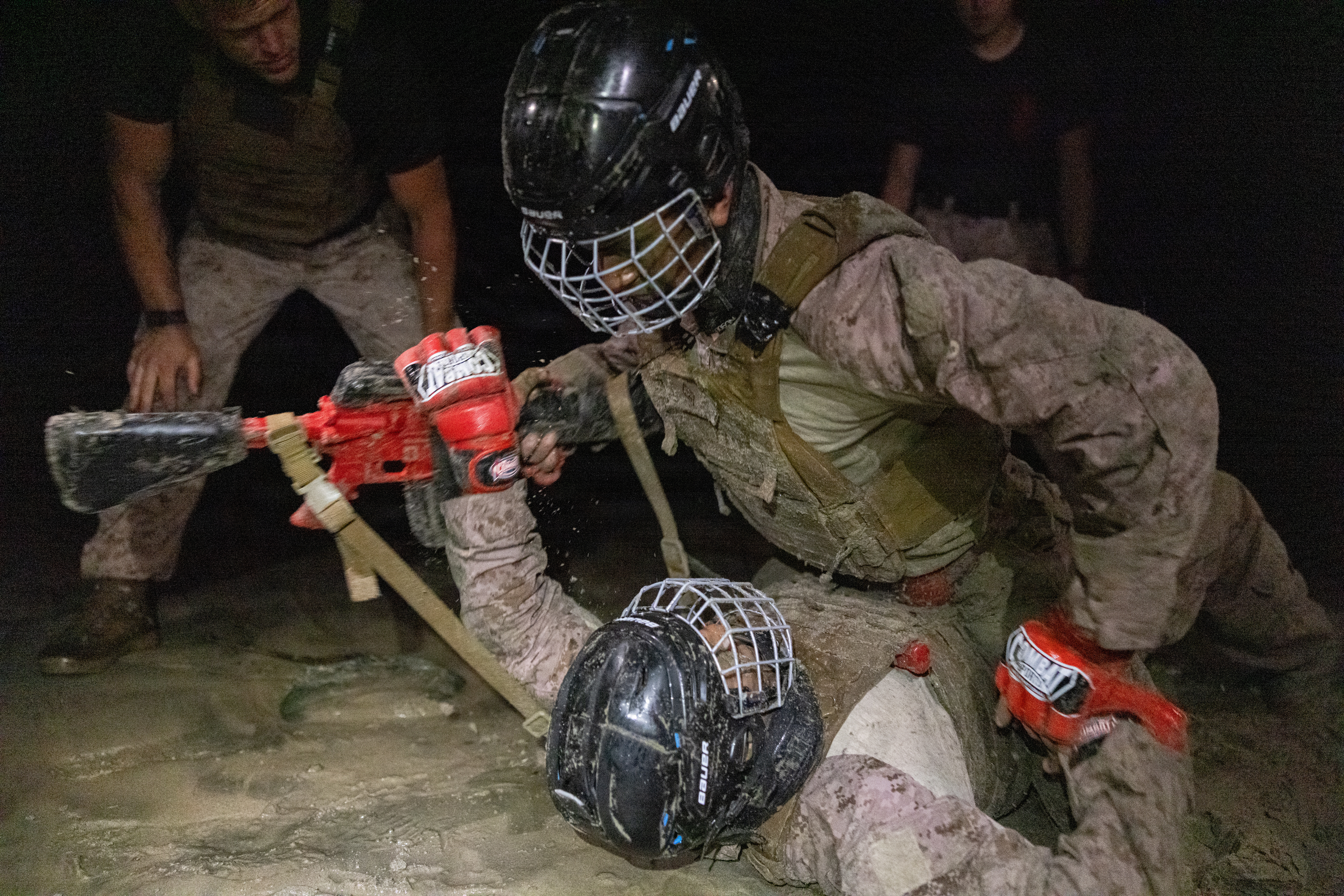 U.S. Marines with Martial Arts Instructor Course 48-26 weapon free spar as part of the culminating event at Marine Corps Base Camp Pendleton, California, Feb. 26, 2026. The MAI course is a physically and mentally demanding three-week training cycle designed to strengthen the mental and moral resiliency of Marines through tough realistic training, enabling Marines to train their respective units. (U.S. Marine Corps photo by Sgt. Kyle Chan)