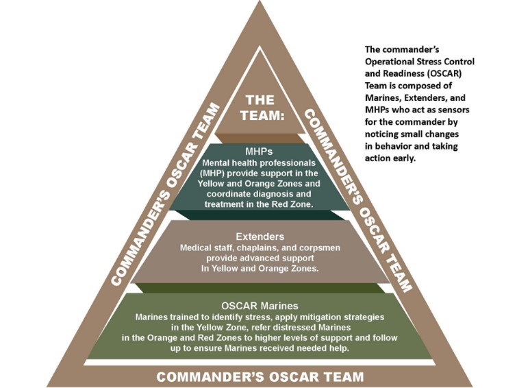 OSCAR Teams are comprised of specially trained Marines (known as OSCAR Marines), Extenders (chaplains and medical staff), and Mental Health Professionals (MHP). They assist commanders and Marine leaders in preventing, identifying, and managing the impacts of stress to maintain warfighting capability. The OSCAR Program achieves this by enabling a cohesive ready force that promotes the long-term health and well-being of Marines.